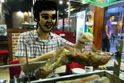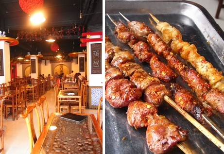 窓際席で、人々が羊串を美味しそーうに食していた。