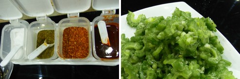左から、味の素、クミン、唐辛子粉、コチュジャン(たぶん)。