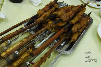 窓際席で、人々が羊串を美味しそーうに食していた。