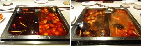 麻辣火鍋(辛い痺れる鍋)と、番茄火鍋(トマトベースの鍋の素)