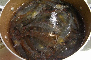 鍋の中で、エビを水道水でガャーっと洗った。まだ動くエビ。