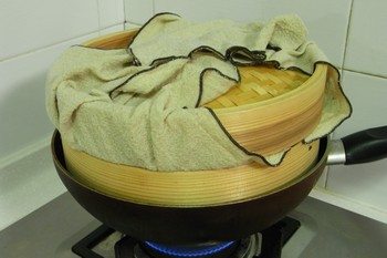 蒸籠に蓋。沸いた湯の上で強めの火で、4分半程蒸してみた。