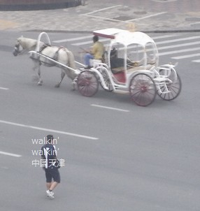 馬車に乗って、西洋建築の残る通りを観光できる。)