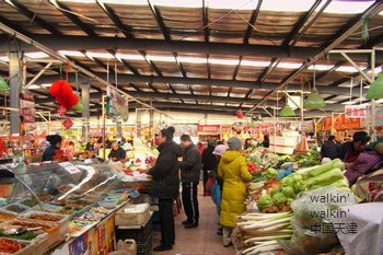 写真の左手前に写っているお店は、平山道近くの卫星菜市场の漬物屋。