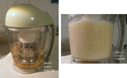 前夜、大豆を一晩水に浸け、翌朝、新しい水と戻した豆を豆浆机に入れ、