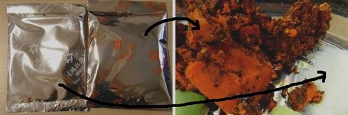 赤色のが固形状の材料。右の白いのは調味料(塩、砂糖、味の素など)。