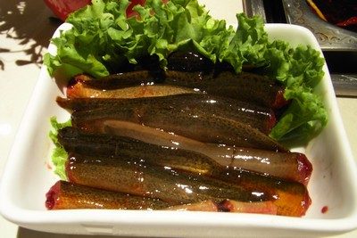 蒸したモチ米等の間に小豆や棗などの甘い餡が挟みこまれています。